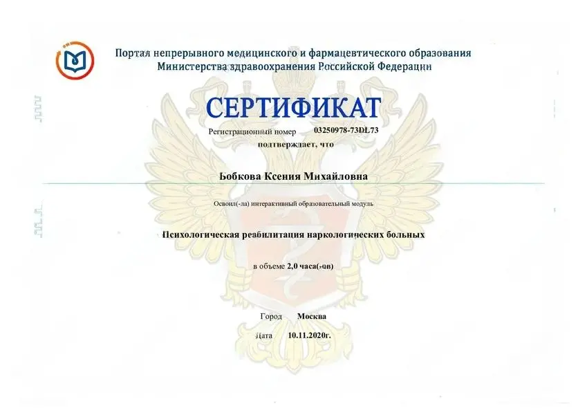 Бобкова Ксения Михайловна добилась значительных успехов в области лечения алкогольной и наркотической зависимости, внедрив в практику метод комплексного подхода, который сочетает медикаментозную детоксикацию с индивидуальными психотерапевтическими сеансами. Благодаря этому методу многие её пациенты достигли устойчивой ремиссии и вернулись к полноценной жизни.